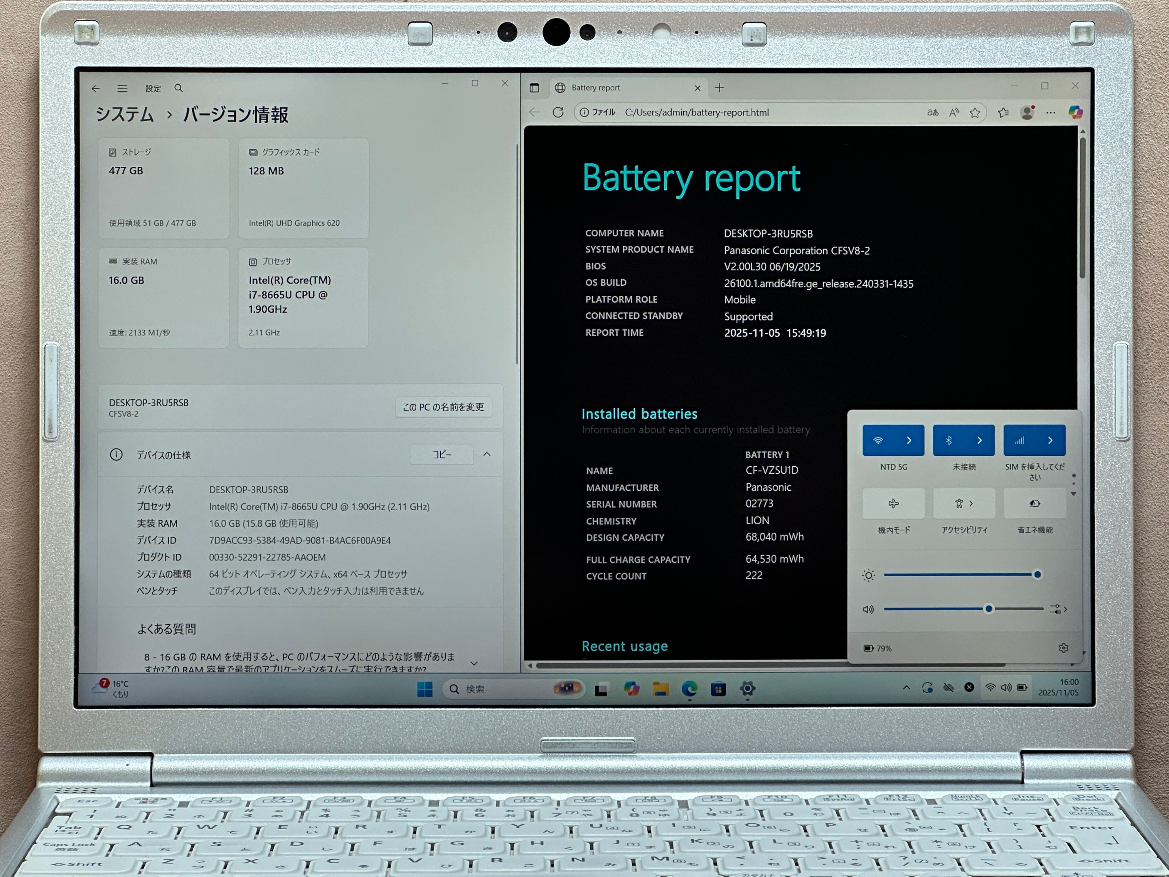 ・CPU: Core i7-8665U 1.9GHz, ターボブースト: 4.8GHz