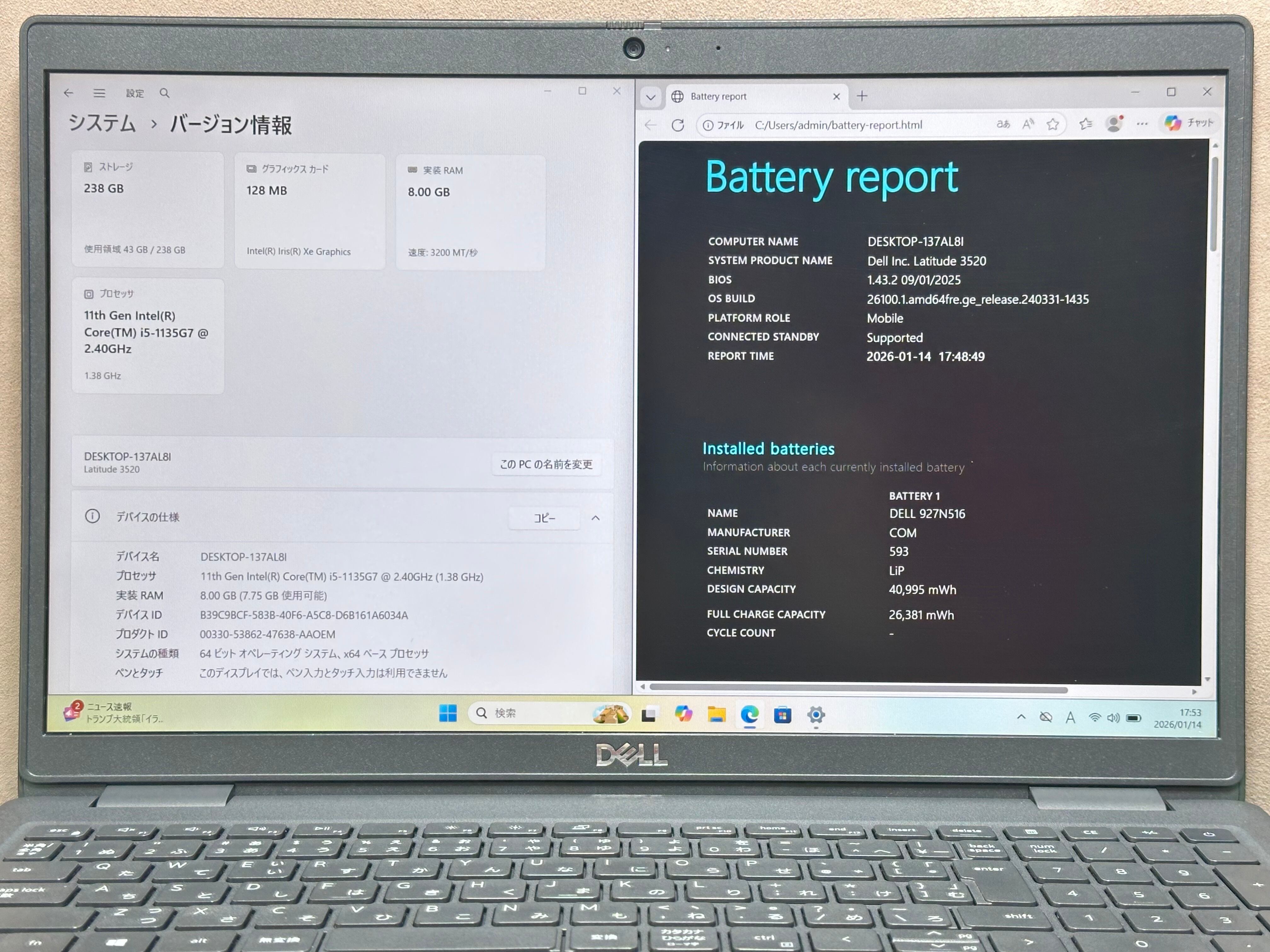 【機能状態】B : 通常使用に問題ありませんが、バッテリーが劣化しています。